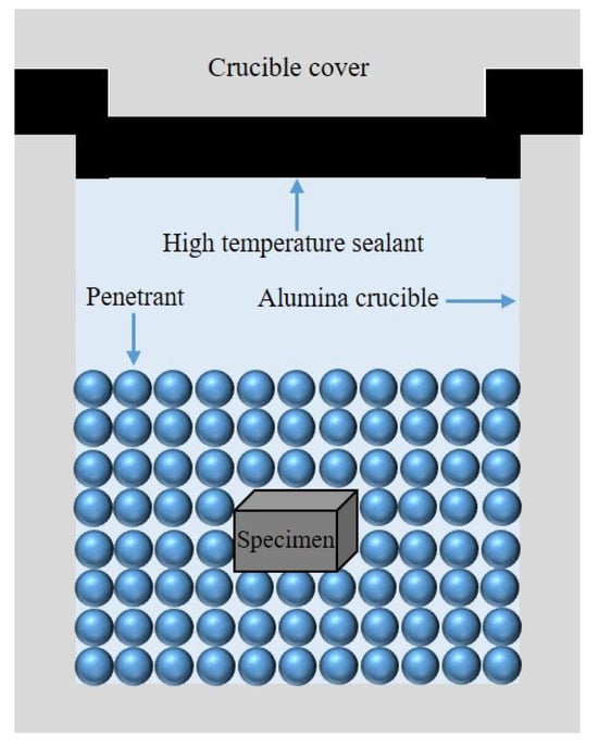 The specific procedure was as follows: First, the well-mixed pack mixture was placed into an alumina crucible (20 mm × 20 mm × 17 mm), filling half of its volume. The sample was then positioned on top of the pack mixture, ensuring it was centrally placed within the crucible. Subsequently, more pack mixture was added until the sample was completely covered. To enhance sealing, a high-temperature sealing adhesive (HBC-1096) was evenly applied to the lid’s surface. This sealant, produced by Guangzhou Nairui Environmental Protection Technology Co., Ltd. (Guangzhou, China), is resistant to high temperatures and was primarily used to seal the edges of the crucible lids. The crucible was then placed in a drying oven at 100 °C for 1 h to allow the adhesive to fully solidify and to preheat the pack mixture (Figure 2). Finally, the sealed crucible was placed into a box-type resistance furnace for annealing. After the aluminized layer had formed, the sample was allowed to cool to room temperature in the furnace. In this study, we prepared a total of 32 samples, which were divided into two groups: one group consisted of the original untreated samples, and the other group comprised samples treated with aluminizing.