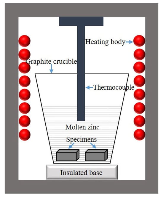 The hot-dip galvanizing process is one of the most widely used methods for effectively preventing the corrosion of steel materials [1]. This process typically involves pre-treating the steel material through cleaning and activation, followed by immersion in molten zinc at an elevated temperature [2]. Through the iron–zinc reaction, a strongly adherent zinc alloy coating forms on the steel surface [3]. However, during the hot-dip galvanizing process, critical components inside the zinc pot are continuously exposed to high-temperature molten zinc. Due to the extremely high temperature and strong chemical reactivity of liquid zinc, the materials used for these components inevitably suffer from corrosion [4]. Metal components that remain exposed to liquid zinc for extended periods often fail to meet the required corrosion resistance, leading to frequent occurrences of corrosion and damage during production [5]. As the corrosiveness of molten zinc intensifies, equipment and components inside the zinc pot undergo severe degradation, which not only affects production efficiency but also increases the frequency of maintenance and replacement, raising operational costs for enterprises [6].