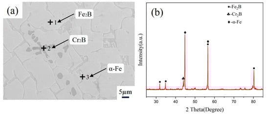 Through microstructural observation and XRD analysis (Figure 4) of the Fe-20Cr-5B-3Al alloy, it was found that the alloy primarily consists of a large gray-white phase, strip-shaped dark-gray phase, and a small amount of granular black phase. The XRD spectrum shows that the alloy mainly contains Fe2B, α-Fe, and Cr2B phases. Among these phases, the diffraction peaks of the Fe2B and α-Fe phases are relatively strong, indicating that they are present in relatively high proportions in the alloy. In contrast, the diffraction peaks of the Cr2B phase are weaker, suggesting a lower content.