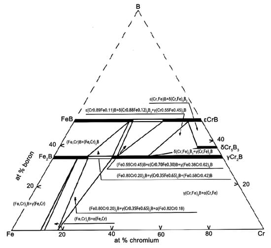 Combining the results from the EDS analysis (Table 1), it can be confirmed that the large gray-white phase corresponds to the Fe2B phase, the strip-shaped dark-gray phase corresponds to the α-Fe phase, and the small granular black phase corresponds to the Cr2B phase. This represents a general pattern observed on the surfaces of the original sample group analyzed in this study. The EDS results reveal significant differences in elemental composition across the three analyzed regions. Point 1 (Fe2B phase) contains approximately 29.65 at.% Cr and 69.08 at.% Fe, indicating a notable dissolution of Cr in the Fe2B lattice. Similarly, Point 2 (Cr2B phase) is rich in Cr (60.36 at.%) but also contains a substantial amount of Fe (39.48 at.%). Point 3, corresponding to the α-Fe phase, shows a markedly different composition, with 12.91 at.% Al and only 2.05 at.% Cr, while Fe remains dominant (85.04 at.%). This implies that aluminum is preferentially dissolved in the α-Fe matrix. Due to the fact that Al primarily dissolves into the α-Fe matrix phase and does not participate in compound formation, the remaining Fe, Cr, and B elements constitute a ternary system in which a significant number of Cr and Fe atoms can be substitutes for each other in the Fe2B and Cr2B phases. This behavior is clearly reflected in the Fe-Cr-B ternary phase diagram (Figure 5) [27].