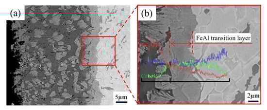 (a) Microstructure of the aluminizing layer of the Fe-20Cr-5B-3Al alloy, (b) and its EDS line scan.