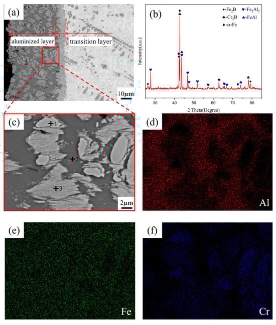 Fe-20Cr-5B-3Al alloy aluminized layer. (a) Microstructure of the aluminized layer; (b) XRD pattern; (c) local magnification of the aluminized layer; (d) distribution of Al element; (e) distribution of Fe element; (f) distribution of Cr element.