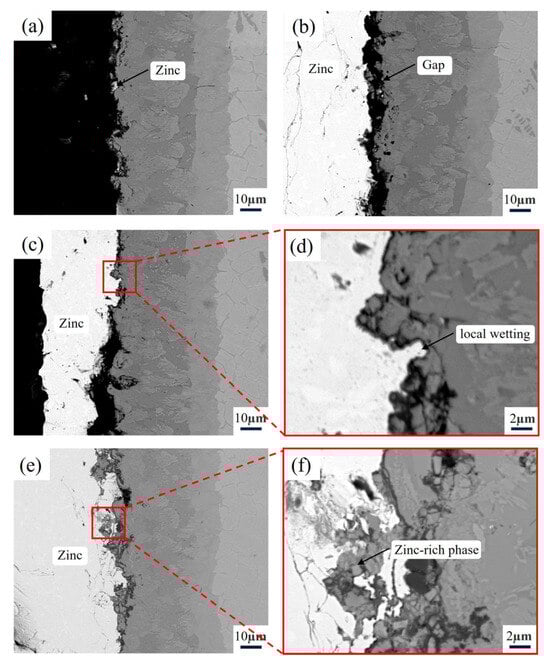 According to Figure 9a, after 16 h of contact with molten zinc, the surface of the sample treated with aluminizing showed no significant zinc adhesion, demonstrating good non-wettability. When the corrosion time was extended to 32 h, as shown in Figure 9b, a zinc layer began to form on the sample surface. However, electron microscope observations revealed that there was still a noticeable gap between the zinc layer and the aluminized layer, indicating that the molten zinc did not establish substantial contact with the aluminized layer. Despite the zinc layer gradually increasing in thickness, the sample still did not exhibit wettability with the molten zinc, suggesting that, in the early stage of corrosion, the aluminized layer maintained non-wettability with the molten zinc.