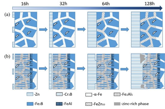 Zinc liquid corrosion mechanism: (a) Fe-20Cr-5B-3Al alloy, (b) aluminized Fe-20Cr-5B-3Al alloy.