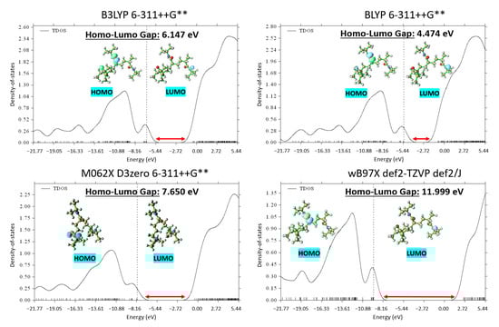 DOS comparative analysis across various theory levels displaying optimal highest-occupied-molecular-orbital–lowest-unoccupied-molecular-orbital gap (HOMO—highest occupied molecular orbital, LUMO—lowest unoccupied molecular orbital).