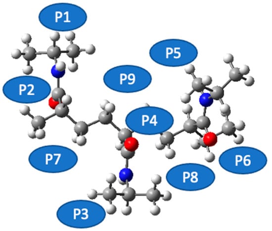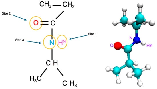 As we progress in our computational exploration of water sorption potential, it becomes indispensable to discern the loci on the PNIPAM oligomer that exhibit the most promising affinity for water molecules. Such an understanding would not only reveal key insights into the water–PNIPAM interaction dynamics but also provide a focused framework to delve deeper into ESP distributions, topological analysis, and other post-DFT evaluations, thereby paving the way for a more nuanced understanding of the water sorption mechanism in PNIPAM.