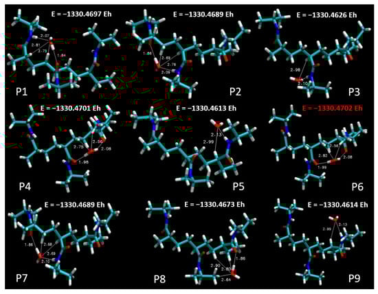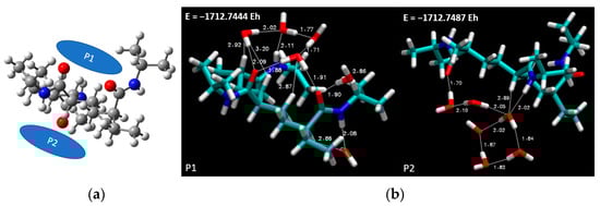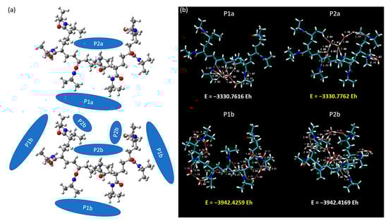 Our investigations revealed intriguing outcomes, with scenarios P2a and P1b recording higher total energies at −3330.7762 EH and −3942.4259 EH, respectively, as depicted in Figure 13. As a keen observer might anticipate, the b configurations inherently present higher binding energies due to the increased number of water molecules interacting with the PNIPAM structure.