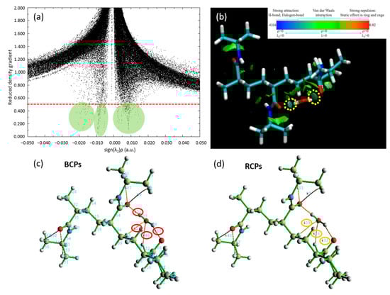 Visualization and quantification of interatomic interactions in the trimer PNIPAM–water complex: insights from QTAIM analysis. (a) RDG scatter plot; (b) Non-Covalent Interactions (NCI) plots; (c) Bond Critical Points (BCPs); and (d) Ring Critical Points (RCPs). Regarding subfigures (a,b), the isosurfaces are coloured according to the values of sign(λ2)ρ (a.u.), from −0.04 to 0.02 a.u. Colour online: blue represents strong attractive interactions, green indicates van der Waals interactions and red indicates repulsive/steric interactions. Regarding subfigures (c,d), the red and yellow circles show the BCPs and RCPs of the most relevant PNIPAM 3mer-water interactions obtained via QTAIM calculation, respectively.