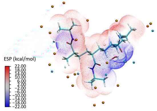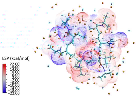 To build a holistic understanding of these interactions, we conducted a detailed analysis of ESP, illustrated in Figure 15 for the P2a configuration. The isosurface representation of the ESP depicts a scattering electron distribution across the 7mer macrostructure. The distinct separation between the water clusters and the PNIPAM structure—as seen in the ESP—underlines the formation of strong bonds. The analysis not only shows a combination of individual atomic potentials, but rather showcases how these potentials influence and shape each other, leading to a unique electronic topography that is emblematic of the PNIPAM–water interaction. The isosurface representation in Figure 15 reveals a scattering electron distribution that reflects the electronic reorganization occurring within the system. The electron density is dynamically redistributed in response to interactions with neighboring atoms. Notably, the ESP shows a distinct spatial separation between the water clusters and the PNIPAM structure. It is evident that the structure of the polymer and the water clusters foster a cooperative environment that encourages the formation of robust bonds, thereby highlighting the innate compatibility of the water clusters and the PNIPAM structure. This distinct separation, as seen in the ESP, underlines the strong interaction between the entities, leading to an efficient transfer of charge and, ultimately, the formation of strong, stable bonds.