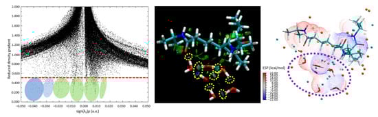 (left) Scatter plot of the RDGs, (center) visual interpretation of the RDGs, and an (right) ESP isosurface analysis of the PNIPAM 3mer case surrounded by the water molecules case.