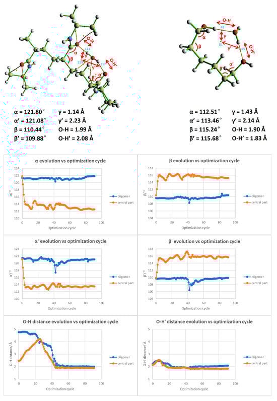 In the case of the isolated linker section, the geometric parameters demonstrate a consistent trend up to the addition of 10 water molecules, indicative of a stable interaction system with a somewhat linear response to hydration. The relatively steady trend suggests that the linker section can comfortably accommodate up to 15 water molecules without significant alterations to its geometry. However, upon the addition of the 16th (up to the 20th) water molecule, there is a noticeable deviation in the geometric parameters. When the 15th–20th water molecules were introduced, around six water molecules began to drift away from the polymer, signifying a weakened ability of the polymer to retain them. This observation suggests a limit on the number of water molecules that can be effectively coordinated by the polymer, approximated at 15 above the linker. The result is perfectly aligned with some experimental studies found in the literature obtained through high-frequency dielectric relaxation techniques [37,38], which report 11 hydrated water molecules per monomer unit below the LCST. This limitation provides a valuable reference for molecular dynamics (MD) studies and experimental comparisons to enhance our understanding of the water-binding capacity of PNIPAM. This disruption could be attributed to a saturation point where the linker section has maximized its water retention capacity. This observation uncovers a potential threshold for water sorption for the isolated linker section, beyond which the system’s geometric stability is affected. When considering the full 3mer structure, the impact of the hydration process becomes even more nuanced. We consider that to be the water sorption capacity of the complete 3mer structure, providing an intriguing comparison point with the isolated linker section. It seems that the more complex the structure, the more water molecules it can stably accommodate, a factor that may be attributed to the increased number of interaction sites within the structure. By comparing the isolated linker section with the full 3mer structure, Figure 12 serves a dual purpose: it pinpoints the pseudo-saturation point for water sorption for each configuration and provides invaluable insights into the differential response of the structures to hydration. Furthermore, this comparison underlines the remarkable ability of the PNIPAM structure to adapt to incremental hydration, thereby spotlighting the polymer’s potential for various hydration-sensitive applications.