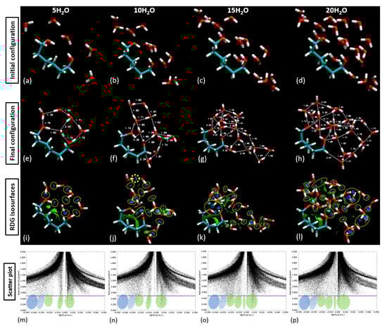 Sequential population of the central part of the PNIPAM linker with increasing quantities of water molecules (5, 10, 15 and 20 H2O). (a–d) Initial configurations showing the random spatial distribution of water molecules around the PNIPAM linker; (e–h) Final configurations after DFT calculations, illustrating the formation of hydrogen bonding networks between water and PNIPAM. Selected bond distances (in Å) highlight interaction strengths and structural reorganization; (i–l) RDG isosurfaces revealing noncovalent interactions (green for van der Waals, blue for hydrogen bonding, and red for repulsive forces). Yellow dotted circles indicate key interaction regions; and (m–p) Scatter plot of the RDGs corresponding to each system, showing an increase in attractive and van der Waals interactions with rising water content, indicating a pseudo-solubility threshold near 15–20 H2O.