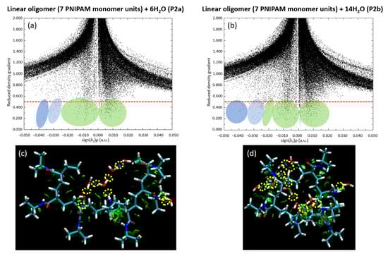 Decoding the PNIPAM–water interaction: scatter plot of configurations (a) P2a and (b) P2b, and RDG analysis (c) P2a and (d) P2b.