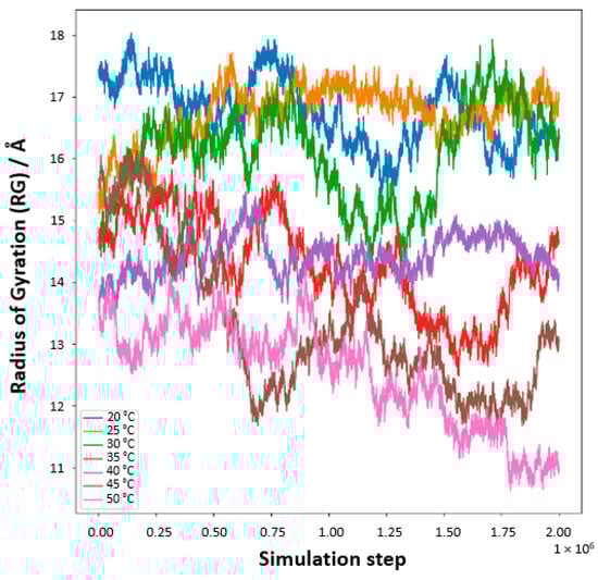 Our meticulous exploration into the temperature-responsive behavior of PNIPAM in water solutions unveils a pronounced temperature-dependent modulation of the polymer’s radius of gyration (Rg, Figure 16). At reduced temperatures, specifically 20 °C and 25 °C, the Rg values surge, signifying an expanded state of the PNIPAM chain. This expansion ostensibly results from enhanced hydration, where the polymer adopts an extended conformation within the aqueous domain. The elevated Rg values are emblematic of a well-solvated and unfurled chain, predominantly at these lower temperature conditions. As the thermal conditions are escalated, particularly approaching the 30 °C to 35 °C range, a conspicuous diminution in Rg values is observed. This reduction symbolizes a contraction of the PNIPAM chain, a phenomenon that is resonant with the polymer’s LCST behavior. The chain’s transition from a hydrophilic to a hydrophobic nature is marked by a collapse, aligning with the LCST concept where PNIPAM exhibits a phase transformation. Ascending further into the thermal scale, temperatures surpassing 40 °C mark a continued decline in Rg values, delineating a transition into a globular, more condensed state of the polymer. This morphological alteration is attributed to the ejection of water molecules concomitant with the temperature elevation past the LCST, heralding a compacted state of the chain.