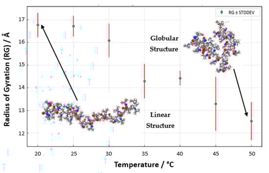 To better visualize the geometry of the structure, we averaged the Rg values through the structure relaxation period, as shown in Figure 17 (Rg_averaged vs. temperature with standard deviation). The aggregation of these data points, with associated standard deviations as error bars, presents a compelling narrative of the structural evolution of PNIPAM, echoing the delicate interplay between temperature and polymer solvation. Regarding conformational properties, it is also worth mentioning that this decrease in Rg values from the coil state to the globule state as temperature increases is consistent with some experimental studies found in the literature using small-angle X-ray scattering (SAXS) [39], which report an Rg of 6.0 ± 0.3 nm for a linear PNIPAM of 92 kg/mol in the coil state and 2.2 nm for cyclic PNIPAM in the globule state. Furthermore, our simulations capture the coil-to-globule transition around 32 °C, corroborating experimental observations of PNIPAM’s LCST behavior.