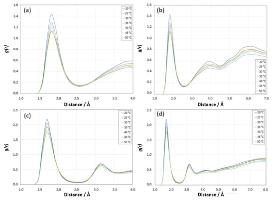 (a) Radial distribution function g(r) showing HN_O site of PNIPAM–water coordination at different temperatures and 0–5 Å distance range, (b) 0–7 Å distance range. (c) Radial distribution function g(r) showing O_H site of PNIPAM–water coordination at different temperatures and 0–5 Å distance range, (d) 0–8 Å distance range.