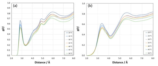 Radial Distribution Function Analysis for [HN PNIPAM _O water] site: The first sharp peak around 2 Å is indicative of strong interactions between the hydrogen atoms of PNIPAM and the oxygen atoms of water, which is typical of hydrogen bonding, as shown in Figure 19a. The position of this peak is consistent with the expected distance of a hydrogen bond. The height of the first peak decreases with increasing temperature. At lower temperatures (20 °C and 25 °C), the higher peak suggests stronger or more hydrogen bonding, consistent with the more hydrated state of PNIPAM at these temperatures. As the temperature increases, the reduction in peak height indicates weaker or fewer hydrogen bonds, which correlates with the decreased hydration of PNIPAM upon approaching and surpassing its LCST. The behavior in the intermediate distance range (approximately 3–5 Å) shows less variation with temperature compared to the first peak, but still suggests some temperature-dependent changes in the local structure or solvation shell around the PNIPAM. Beyond 5 Å, the g(r) curves for different temperatures tend to converge, indicating that long-range order is less affected by temperature changes in this system, as shown in Figure 19b. This region reflects the structure beyond the immediate solvation shell, where the temperature effects on the polymer–water interaction are less pronounced. The shape and behavior of the RDF suggest that the PNIPAM’s hydration shell structure changes with temperature, which is typical for polymers exhibiting LCST behavior. At lower temperatures, PNIPAM is well solvated, and as the temperature increases, the solvation structure becomes less defined, reflecting the transition from a hydrophilic to a hydrophobic state.