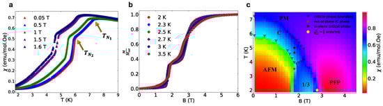 (a) Magnetic susceptibility as a function of temperature, displaying two consecutive phase transitions between paramagnetic (PM) and low-temperature antiferromagnetic (AFM) phases. Figure S2 displays a detailed phase transition analysis for the applied T magnetic field. (b) Magnetization normalized with saturation magnetization as a function of the applied field, displaying a magnetization between AFM on low fields and partially field-polarized (PFP) phases on high fields. The 2 K magnetization data on Figure S3 depict the trace of additional magnetization () that appears between the and PFP phases. (c). Magnetic phase diagram of reconstructed from magnetic susceptibility measurement, displaying following phases: AFM, PM, PFP, , and an in-plane classical critical phase (C) that supports the in-plane order (details in text).