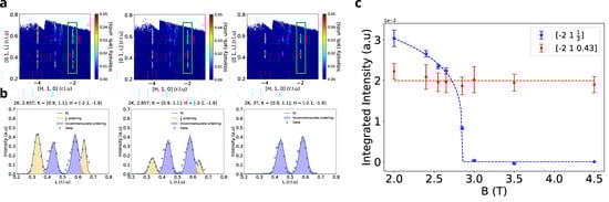 Figure 3c depicts the evolution of intensities of magnetic Bragg peaks related to out-of-plane magnetic orders. The scattering intensities for the incommensurate Bragg peak [−2 1 0.43] sustains to large magnetic fields, while ferrimagnetic commensurate ordering [−2 1 1/3] diminishes as a function of the applied magnetic field and fully disappears in the vicinity of .