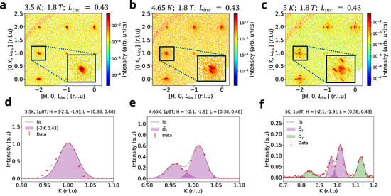 In-plane ordering of critical intermediate phase. 2D slice of has been made with r.l.u integration range at 1.8 T field and [3.5, 4.65, 5] K temperatures. (a–c) Emergence of () and ordering of incommensurate peak splitting as the function of temperature. (d–f) A 1D cut on the K reciprocal direction for r.l.u integration range. () ordering with r.l.u r.l.u and with = 0.14 . ordering exists in the vicinity of 5 K, 1.8 T and is absent for 4.65 K, 1.8 T. Incommensurate out-of-plane ordering sustains throughout the entirety of the intermediate phase between and .