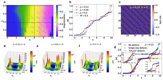 We implement five in-plane and three out-of-plane spin–spin interactions (Figure 1a–c) using a lattice size of spins. Spin–spin interaction parameters are initialized based on Table 2 and varied within a range. For visualization purposes, we plot separate phase diagrams as colormaps on vs. for (). Analysis of phase diagram(s) reveals a magnetization plateau at (Figure 5a, marked with a yellow color). In Figure 5b, it is evident that the one-half magnetization plateau becomes less pronounced as we increase the out-of-plane interaction parameter . The corresponding spin arrangement down–down–down–up (Figure 5c) evolves according to Figure 5d–f, represented with the FFT calculation of spin ordering in the plane: