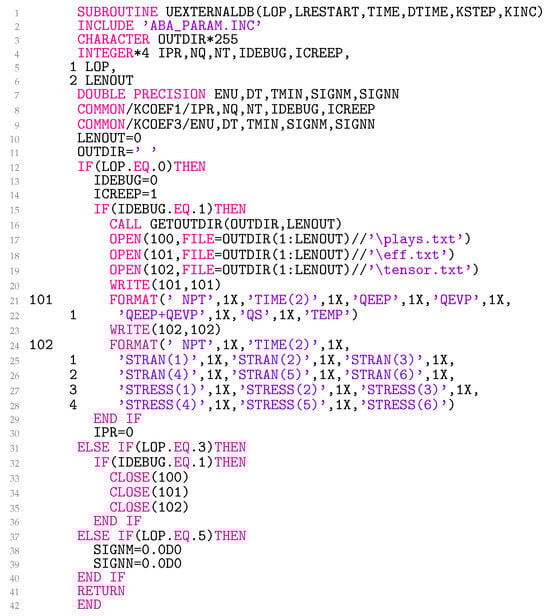 Lines 53–63 in Figure 7 are needed to read the solution-dependent state variables in QEEP, QEVP, QS, QMAX, CIDX, CRIT, the sign of (SIGNQ), and PLQ. In lines 64–71, the data about the previously accepted equilibrium state are written in ‘plays.txt’, ‘eff.txt’, and ‘tensor.txt’ when DEBUG=1. In this particular case, the data for element number 1 are stored at all integration points. Line 64 may be changed as required.