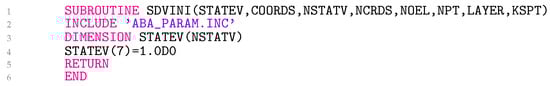 The subroutine SDVINI, as depicted in Figure 2, assigns the value of to STATEV(7) in order to ascertain the direction of the radial elastoplastic strain increment during the first step within the UMAT subroutine.