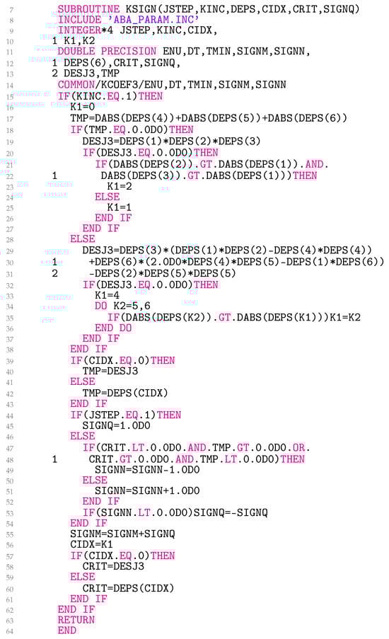 Line 15 shows that the sign is fixed only at the beginning of the step, assuming that SIGNQ remains constant throughout the step. Lines 16–38 calculate , which is represented in the code as DESJ3, where DEPS stands for the deviatoric elastoplastic strain tensor increment. Two cases are considered. If is diagonal, DESJ3 is calculated in line 19. If , the integration point is in pure shear. In order to still be able to define the sign, we have linked the sign to the DEPS(K1) as listed in lines 20–27. For nondiagonal , DESJ3 is calculated in lines 29–31. In the case of pure shear, the sign in lines 32–37 is associated with the absolute largest nondiagonal DEPS(K1). It can be further noted that K1 for pure shear is either 1, 2, 4, 5, or 6 and 0 otherwise. The value is stored in line 56 in the state variable CIDX.