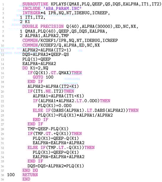 The subroutine KPLAYS (Figure 4) takes as input the maximum radial elastoplastic strain (QMAX), the radial elastoplastic back-strains (PLQ), as QEEP, as QS, and the temperature index for the previous IT1 and the current IT2 state. The number of yield radii (NQ), the yield radii (Q) for , and the temperature-dependent Prandtl densities (ALPHA) are available in the subroutine as global variables. The material parameter Q is a static array with a maximum length of . The same applies to PLQ. ALPHA also represents a static array. Its length is currently limited to . The number of distinct temperatures (NT) is also a global variable, currently limited to 750. The array lengths can be adjusted, uniformly, in all subroutines. ALPHA1 and ALPHA2 contain and , respectively.