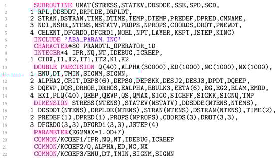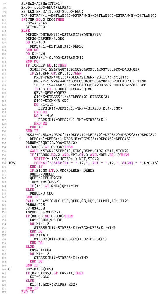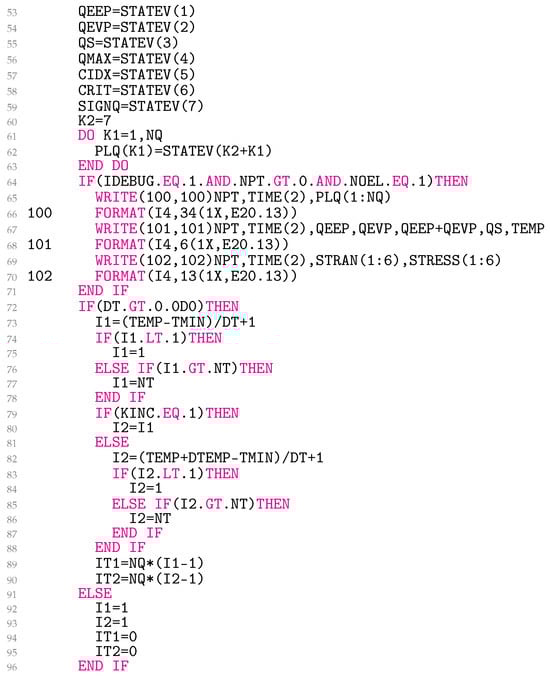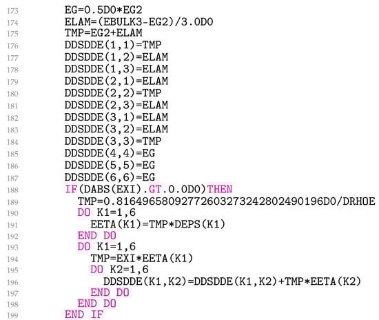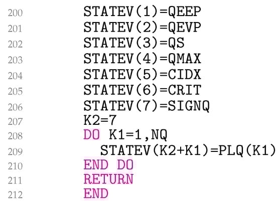 In lines 173–187 (Figure 9), Equation (32) is coded, and in lines 188–199, the third summand of Equation (29) is added to the material Jacobian for non-zero EXI. The variable EETA is . Equations (29) and (32) represent simetric matrices. UMAT needs the material Jacobian for engineering shear strains. Unfortunately, it turns out that the engineering shear strains cause the originally symmetric matrix to become asymmetric. It is worth noting that this problem is not related to the model presented, but, rather, is specific to Abaqus. As a result, lines 189–198 follow the same logic as used in the Abaqus help files for coding kinematic hardening plasticity. Finally, in lines 200–210 (Figure 10), the variables QEEP, QEVP, QS, QMAX, CIDX, CRIT, SIGNQ, and PLQ are written to the solution-dependent state variables.