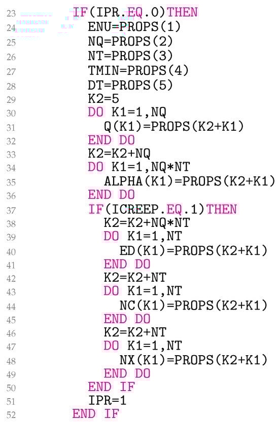 The reading of the material parameters stored in the file *.inp is explained in Figure 6. The Poisson’s ratio in PROPS(1) is stored in the global variable ENU. The next values in the user-defined array of material constants PROPS associated with the user material are NQ and NT. The minimum test temperature (TMIN) for which the material parameters are available and the corresponding temperature increment (DT) are read in lines 27–28. In lines 29–32, the yield radii (Q) for are read in Q. The first yield radius is always 0. Temperature-dependent Prandtl densities , where for and , are read in a one-dimensional array ALPHA in lines 33–36. This is done so that values for temperature appear first in ALPHA, then values for , and so on. The variable ends with values for .