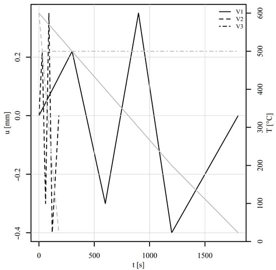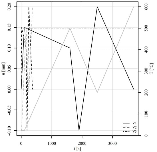 A perforated plate consisting of 15,063 finite elements of linear type C3D8 and 20,872 nodes was subjected to six variable thermomechanical load histories, shown in Figure 11 and Figure 12. Tension–compression and shear loads were considered. For each load, three variants V1, V2, and V3 were investigated. Variant V1 represents a variable mechanical and thermal load (solid lines). Variant V2 differs from V1 only in the loading rate, which is 10 times higher than for V1 (dashed lines). Variant V3 shares the same mechanical load as V1 but is conducted under constant temperature conditions (represented by the dot-dashed line). All simulations were carried out under displacement control. The boundary conditions considered the displacement of the top edge of the perforated plate whilst the bottom edge remained fixed throughout the analyses. The time stepping schemes for variants V1 and V3 were set so that the temperature change for variant V1 could be also achieved experimentally using a coil or a high-power furnace. The time stepping scheme for V2 was set purely to observe the differences in simulated stress–strain fields between variants V1 and V2 due to the loading rate. The mesh convergence analyses were not performed, as the purpose of the examples was to show the working principle of the implemented method.
