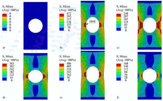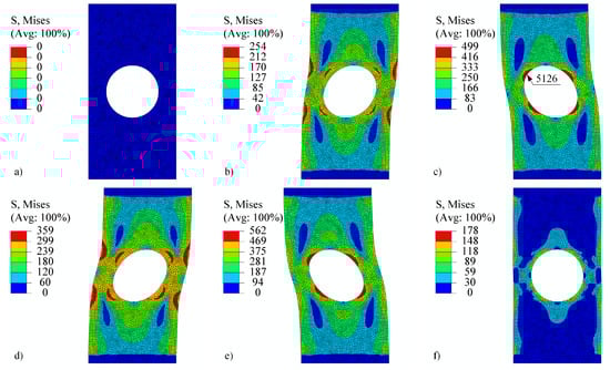 At the beginning of the analysis, the temperature is for load signals V1 and V2. In step 1, the displacement reaches 0.22 mm and the temperature drops to . From the observation of , in Figure 16, it can be seen that the strain rate plays a significant role. While V1 shows a large effect of viscoplasticity, V2 remains almost elastoplastic. In step 2, the displacement changes to −0.3 mm and the temperature drops to . In this step, the effect of viscoplasticity is still present. In the next steps, however, the temperature linearly approaches the room temperature of . The effect of viscoplasticity thus decreases steadily. In step 3, the displacement reaches 0.35 mm, in step 4, it changes to −0.4 mm, and in step 5, it attains 0 mm. The stress–strain responses of V1 and V2 are thus similar, although shifted due to viscoplastic effects in steps 1 and 2. The stress–strain response of V3 remains highly viscous due to constant temperature of throughout the load history. The residual stresses at the end of the analysis are depicted in Figure 15f.