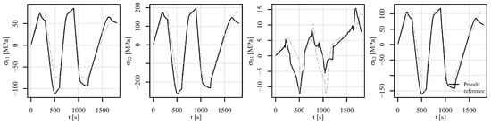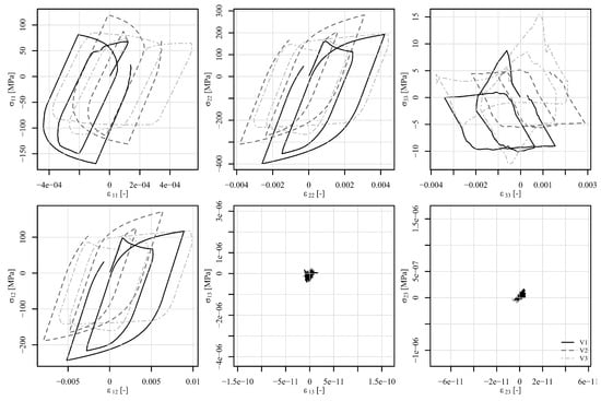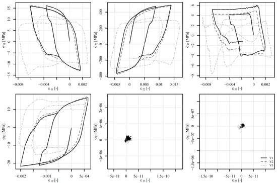 Figure 20, Figure 21 and Figure 22 show the comparison of the stress tensor in element 5126 for the shear load histories V1, V2, and V3, respectively. A slight shift of the signals can be observed for the stress components , , and for all the load histories, but the trends of the stress signals are considerably similar between the compared models. The highest discrepancy amongst the simulated results is obtained for the stress component , but the absolute values of this component have to be considered, which do not exceed 10 MPa.
