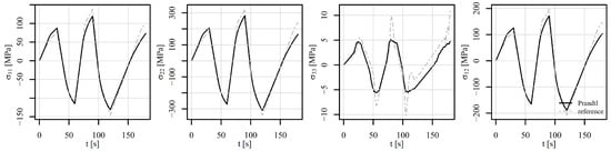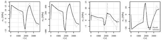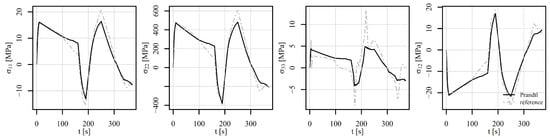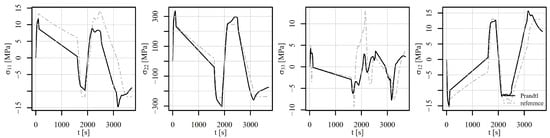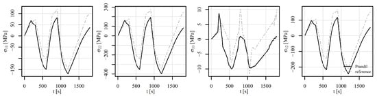 Figure 17, Figure 18 and Figure 19 show the comparison of the stress tensor in element 6868 for the tensile–compressive load histories V1, V2, and V3, respectively. Similar trends of the simulation results can be observed with some differences mostly due to temperature-dependent behaviour of the models. Consequently, the highest discrepancies for stress components and in Figure 17 and Figure 18 can be noticed after 1000 s and 100 s, respectively, where the highest temperature gradient during the loading is applied. The differences are therefore smaller for stress components in Figure 19, where constant temperature loading is considered.