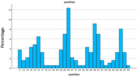 We analyzed histologies collected from 118 males and 110 females, with an average age of 56.30 ± 12.968. Forty-one histologies were excluded from the study as they were produced by mixing the treated tooth with market biomaterial. Thus, the data that met the inclusion and exclusion criteria resulted in 187 cases, of which 90 were female and 97 were male. Figure 1 shows the distribution of the samples by biopsy site. It is noteworthy that the highest number of samples were taken from the areas around the first molars, consistent with the common literature on the most frequent zones of regeneration.