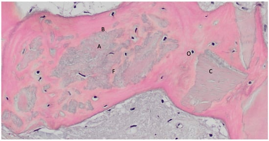 In the analyzed histologies, different stages of dentin granule resorption were observed (Figure 3), including the presence of osteoclasts actively resorbing dentin granules (Figure 4 and Figure 5), dentin granules completely surrounded by newly formed bone with a cement line (Figure 6), and complete histological images showing residual dentin. The mean values of the histomorphometric analyses are presented in Figure 7.