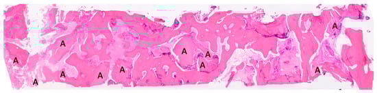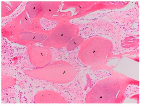 In this histological section, dentin granules (A) are visible, distributed throughout the entire sample, indicating that the tissue was taken from the center of a regenerated area. This suggests that the resorbed granules have transformed into bone. BV 53,659%, VB 45,420%, residual graft TT 8239%. Magnification: 70×, stain: hematoxylin and eosin. (Histology performed by P. Savadori).