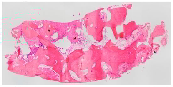 In this histological section, dentin granules (A) are visible, distributed throughout the entire sample, indicating that the tissue was taken from the center of a regenerated area and that the resorbed granules have transformed into bone. BV 57,791, VB 56,978%, residual graft TT 0.813%. Magnification 70×, stain: hematoxylin and eosin. (Histology performed by P. Savadori).