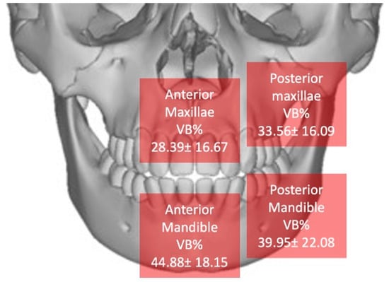 According to the previous article [53], the newly regenerated tissue using the tooth as a graft undergoes a form of homologation with the receiving tissue, particularly after the stimulation from granule resorption diminishes. This process, referred to as proximity homologation, is driven by the natural mechanisms of bone metabolism. The tooth functions similarly to autologous bone, with the resorptive pattern tending to align with the natural anatomy of the original ridge. This effect implies that the bone tissue formed during regeneration is similar in density and NB% to native bone tissue. Therefore, bone density will be lower in maxillary areas and higher in mandibular areas. We processed the data and assessed this aspect in Figure 10. Indeed, as previously demonstrated in another study, using dentin can achieve this result. The image shows the average VB% for each area, confirming previously expressed impressions [61].