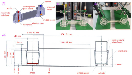 Figure 1c illustrates the components of the experimental electromigration tank, which include cylindrical vessels that communicate and have an inner diameter of 48 mm and a volume of about 69 cm3. These vessels serve as containers for the ionic aqueous solution. The wall facilitating communication between the vessels measures roughly 100 mm in length, with an ionic liquid communication section of 3 mm, ensuring a controlled migration area and safe containment of the liquid. Inside each communicating cylindrical vessel is a conical ground glass funnel (NS 29/32), which forms the anode and cathode chambers. Conical vessels are anchored to the base of the cylindrical vessels using three 3 mm high spacers, creating a space that facilitates the free circulation of the ionic aqueous solution around the conical vessel. The catalytic exchange membrane (polymeric structure for selective ion transport and electrochemical catalysis reactions) situated in each of the conical vessels is affixed to the inner collar of the NS 29/39. It is secured in place by the alternate NS 29/32 cylinder. A comparable electromigration tank with varying specifications has been documented in the literature (L = 100 mm, r = 24 mm; h = 30 mm) [12]. Furthermore, another study incorporated a polypropylene Li battery membrane in a liquid–crown ether system, illustrating the benefit of minimizing crown ether solution loss, as it was not directly exposed to the aqueous solution [13].