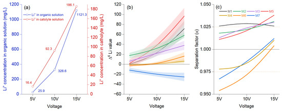 The electromigration results using voltage as reference for migration effects (a) show the average concentration of Li+ in the organic (blue color) and cathode (red color), (b) lithium isotope ratio at 5, 10, and 15 V voltages at the best enrichment factor under the migration time of which was achieved at 48 h for each membrane setting described in Table 1, modeled B-spline function to illustrate a continuous process and bands representing confidence intervals, and (c) the separation factor (α) represented as a modeled B-spline function.