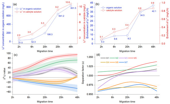 Electromigration results from assessing various migration times as reference for effects (a) show the average concentration of Li+ in the organic (blue color) and cathode (red color) at different migration time, (b) average Li+ concentration changes in relation to time, (c) different isotopic ratio related to migration times at 15 V, modeled B-spline function to illustrate a continuous process and bands representing confidence intervals, and (d) the separation factor (α) represented as a modeled B-spline function.