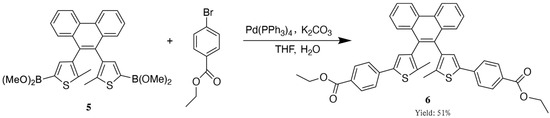 The detailed synthetic procedures for intermediaries 1–4 are provided in the Supporting Information (SI). The boronic ester intermediate (5) was obtained by treating the dichloride precursor with n-butyllithium and trimethyl borate. It was directly subjected without purification to Suzuki coupling with ethyl 4-bromobenzoate under basic conditions, yielding the target diarylethene derivative containing photoresponsive ethyl benzoate groups.
