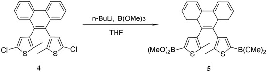 The synthetic route of diarylethene boronic ester is illustrated in Figure 1. Starting with 2-methylthiophene as the raw material, chlorination was performed in THF using NCS under heating in the presence of glacial acetic acid to yield 2-chloro-5-methylthiophene (1) [40]. Biphenyl dicarboxylic acid was converted to biphenyl diacyl chloride (2) using benzoyl chloride in the presence of catalytic N,N-Dimethylformamide (DMF), which then underwent Friedel–Crafts acylation using anhydrous AlCl3 as a catalyst with 2-chloro-5-methylthiophene to yield a diketone intermediate (3) [41,42]. This diketone was subjected to McMurry coupling to form a phenanthrene-bridged diarylethene dichloride (4) [43,44]. The treatment of this compound with two equivalents of n-butyllithium (n-BuLi), followed by the addition of trimethyl borate (B(OMe)3), yielded a boronic ester intermediate (5) [45].