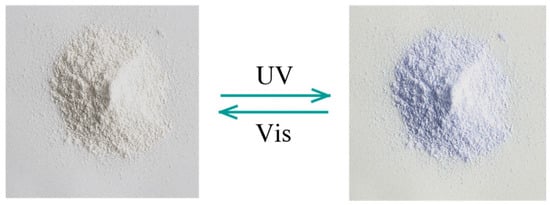 Color changes in diarylethene benzoate powder under UV/visible light.