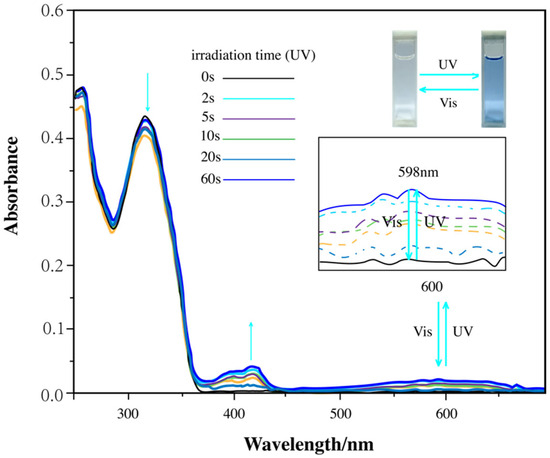 To further verify this transformation, UV–visible absorption spectroscopy (Figure 6) was performed. Before UV irradiation, the compound in the THF solution exhibited an absorption peak at 335 nm, indicating an open-ring form. Upon 254 nm UV exposure, this peak decreased, and a new absorption band emerged at 598 nm. After 60 s of UV irradiation, the compound reached a photostationary state, characterized by an isosbestic point near 350 nm. This spectral change corresponded to the conversion of the colorless open-ring form into a blue closed-ring form. When the UV exposure was discontinued, the absorption spectrum returned to its initial state, and the solution regained its colorless appearance.