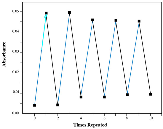 The optical response was further confirmed through absorbance measurements (Figure 7). The absorbance of diarylethene benzoate changed significantly under alternating UV/visible light exposure, demonstrating good photoresponsiveness. Moreover, the photochromic effect remained robust even after 10 cycles of repeated switching, indicating high fatigue resistance.