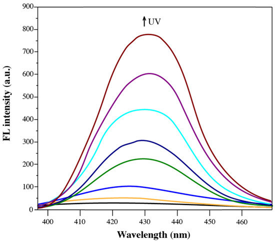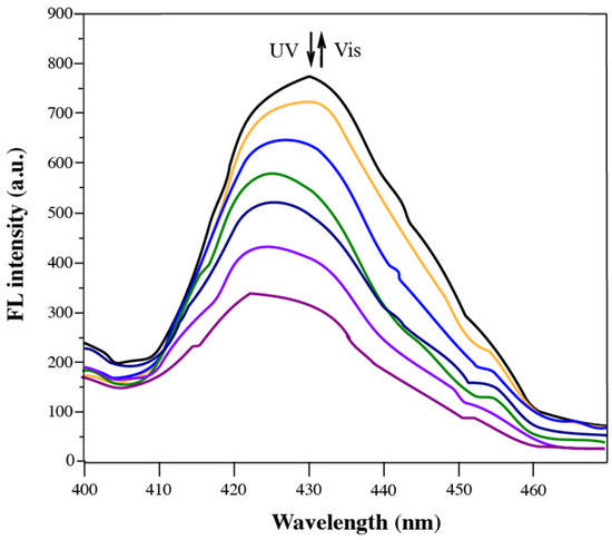 The fluorescence properties of solid-state diarylethene benzoate were investigated via fluorescence emission spectroscopy (Figure 8). As shown in Figure 8, the fluorescence intensity of the compound gradually decreased with prolonged UV irradiation, with the maximum emission observed at 420–435 nm. This reduction was attributed to the photoinduced structural transformation of the diarylethene moiety from its open-ring to closed-ring form, which increased the molecular planarity and enhanced π–π stacking interactions in the solid state [48]. Initially, the compound exhibited moderate solid-state fluorescence due to the restriction of intramolecular motion (RIM), a key mechanism of aggregation-induced emission (AIE) [49,50]. In this state, close molecular packing inhibited the torsional and vibrational freedoms of the aryl and thiophene groups, thereby minimizing non-radiative decay and promoting radiative transitions. However, as the UV irradiation proceeded and the molecular structure became more planar, excessive π–π stacking led to the formation of non-emissive aggregates. This aggregation-caused quenching (ACQ) effect was attributed to increased non-radiative relaxation pathways and exciton annihilation in the densely packed chromophoric system [51]. Additionally, a gradual red shift in the emission wavelength was observed, suggesting a reduction in the excited-state energy level due to stronger electronic coupling among the closely packed fluorophores. Such red-shifted emission behavior is commonly associated with excimer formation or extended conjugation upon photoisomerization [52]. These observations collectively indicate that the fluorescence behavior of diarylethene benzoate in the solid state is highly sensitive to structural and packing changes induced by photoirradiation.