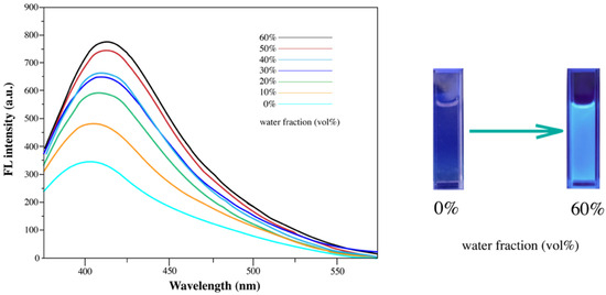 Fluorescence emission spectra were recorded in THF/water mixtures with varying water fractions to investigate the aggregation-induced emission (AIE) behavior of diarylethene benzoate (Figure 10). The compound was highly soluble in THF but poorly soluble in water, and in a pure THF solution (5.0 × 10−5 M), it exhibited almost no fluorescence. However, as the water content increased, the compound began to aggregate due to its limited solubility in aqueous media, resulting in a progressive enhancement in the fluorescence intensity. When the water fraction reached 60%, the emission reached a maximum at 432 nm, demonstrating a typical AIE effect [49,50]. The observed aggregation behavior can be attributed to both molecular and environmental factors. Structurally, the rigid and conjugated diarylethene core, along with the ethyl benzoate substituents, facilitated π–π stacking and enhanced the tendency toward aggregation in water-rich mixtures. In addition, the poor solubility in water induced hydrophobic interactions that drove self-assembly. These aggregation processes restricted the intramolecular rotations of peripheral aromatic units, thereby suppressing non-radiative decay and enabling strong fluorescence emission, a hallmark of AIE-active systems [54].